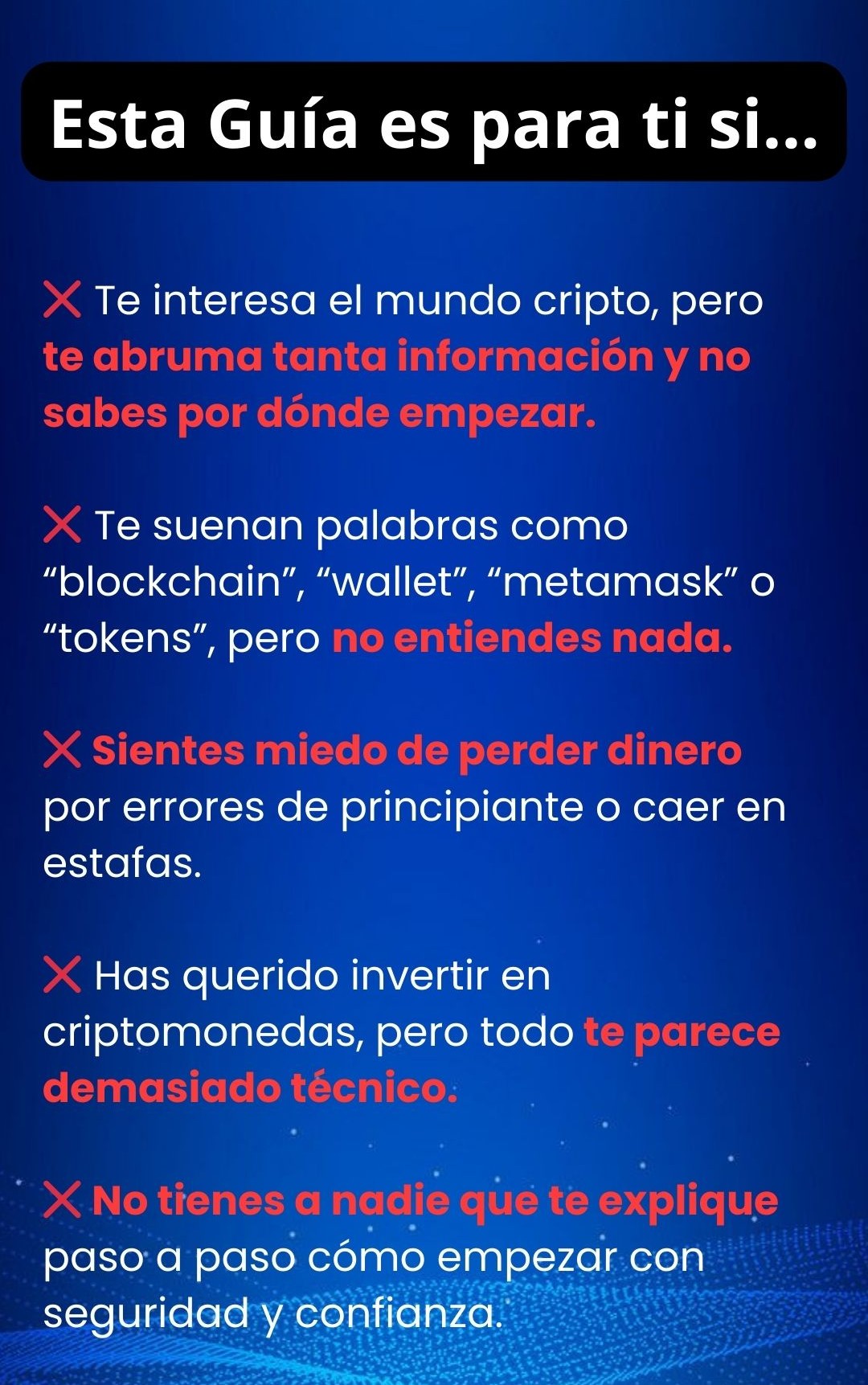 No, está diseñado para principiantes absolutos. Empezarás desde cero, entendiendo el lenguaje cripto, y avanzarás paso a paso hasta manejar tu propio dinero con total seguridad.
