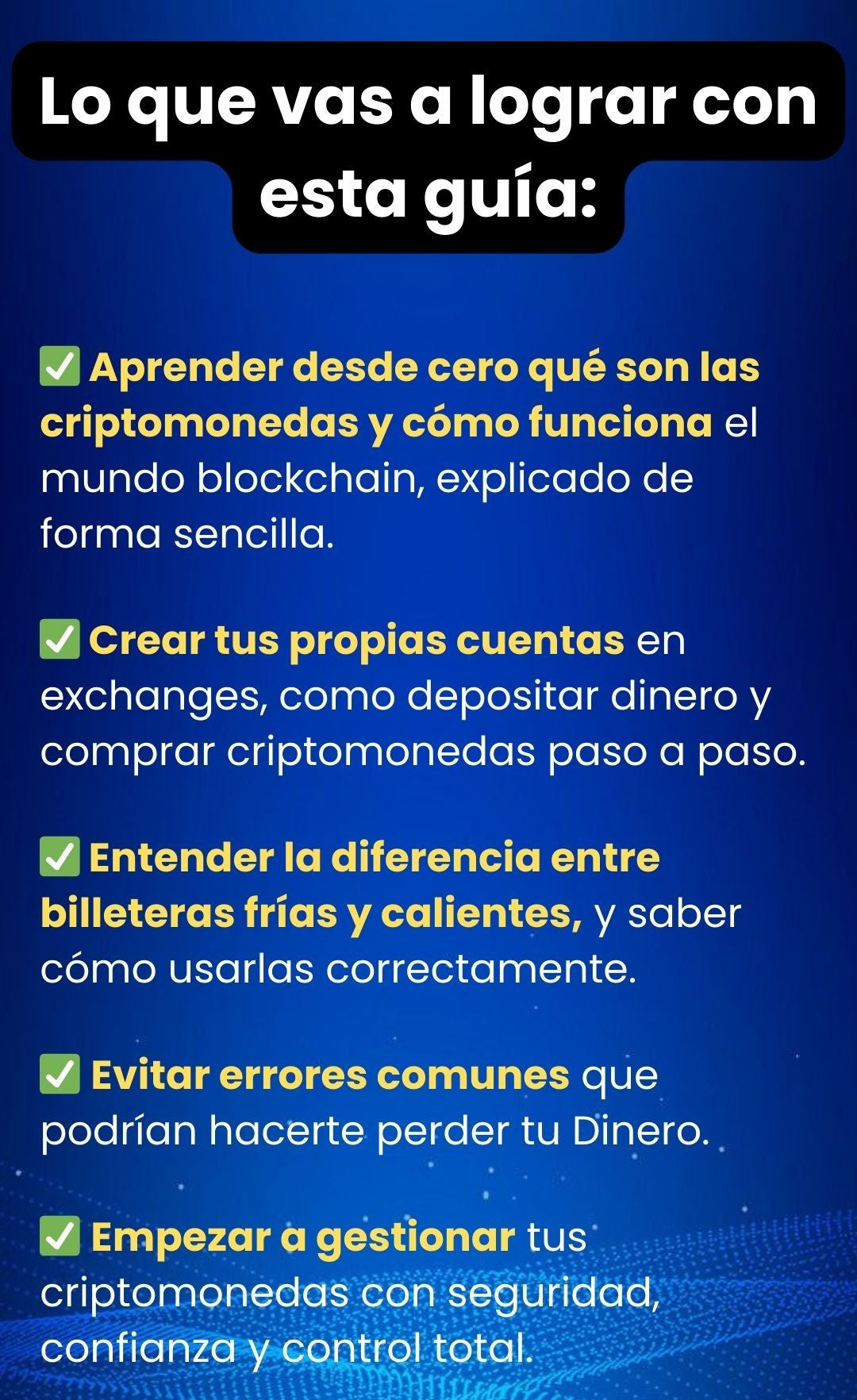 Sí. Aprenderás a comprar, vender, almacenar y mover tus criptomonedas de forma segura, sin depender de nadie más. El objetivo es que tengas control total sobre tu dinero.